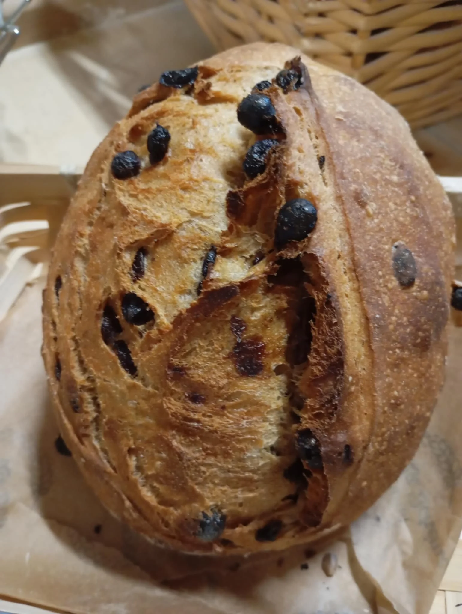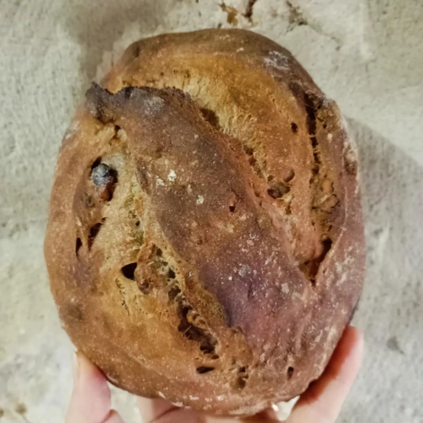 Farine de blé semi-complète, eau, levain de seigle, raisins sec, sel de Guérande