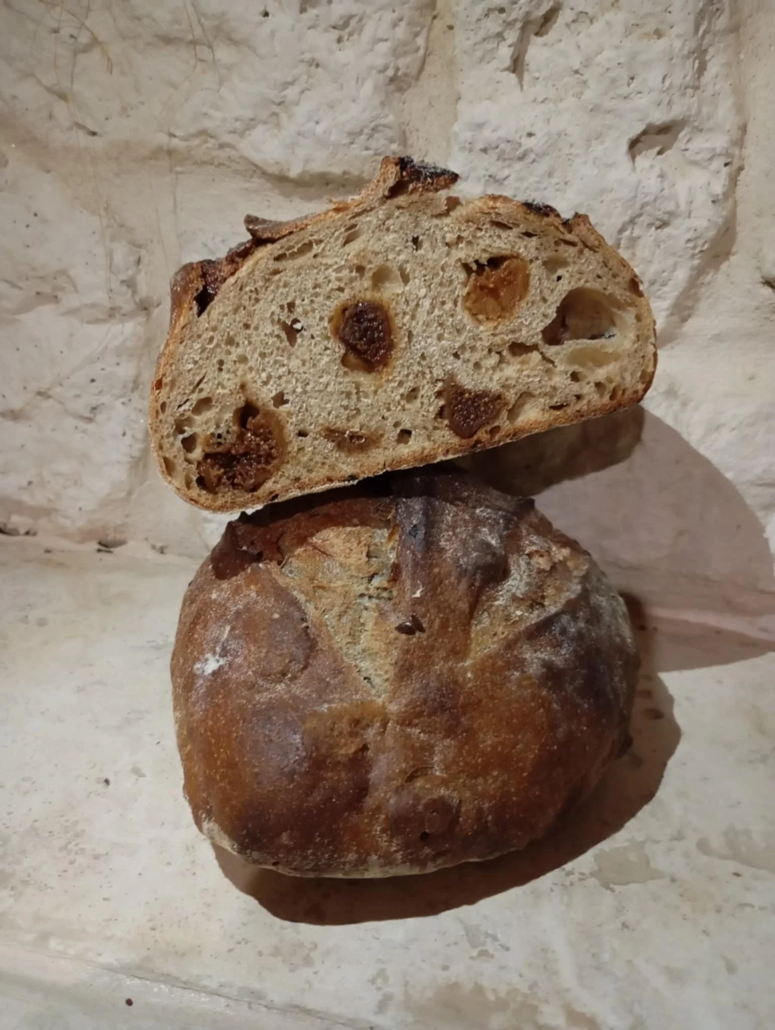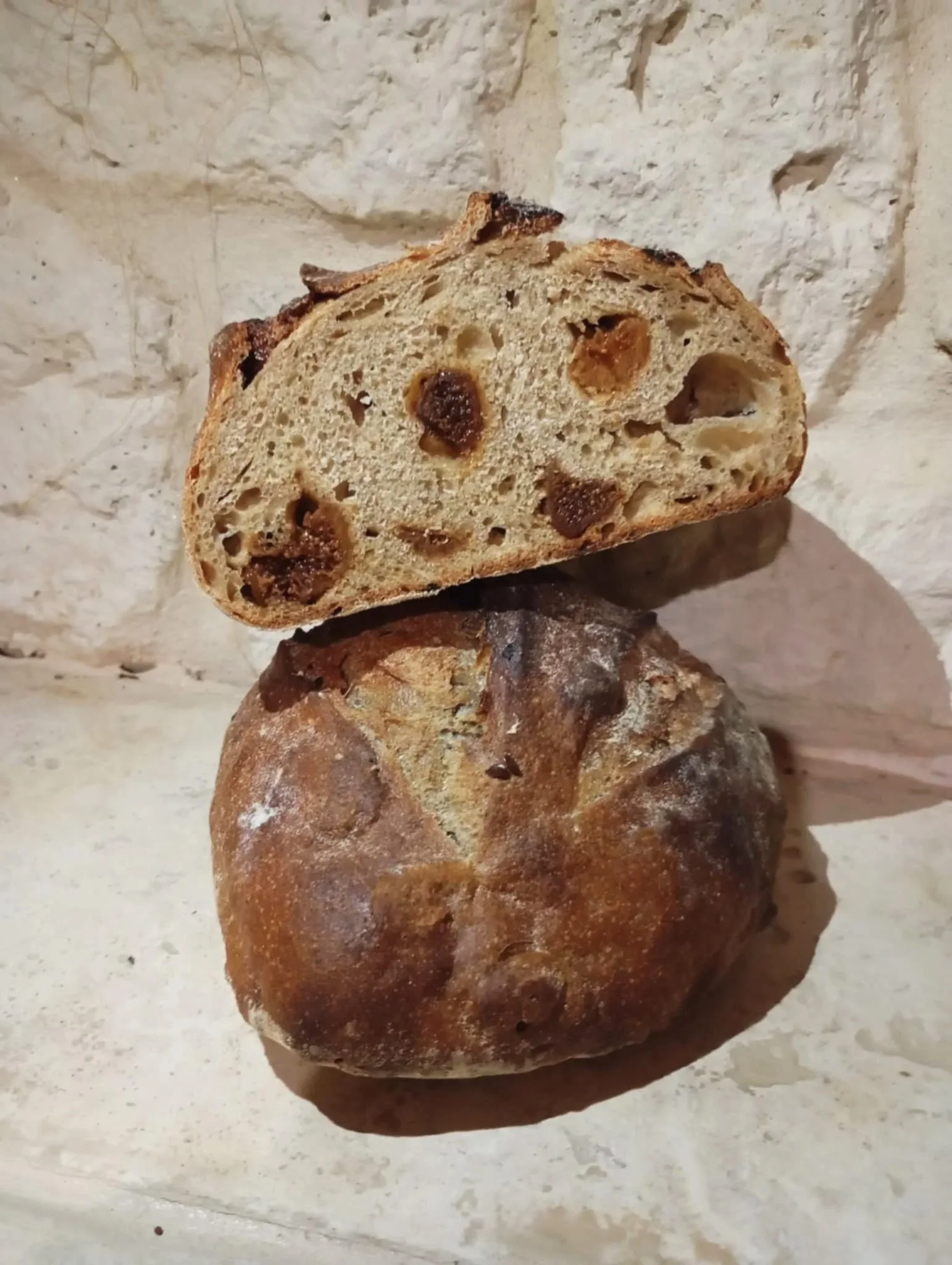 Farine de blé semi-complète, eau, levain de seigle, figues, noisettes, sel de Guérande